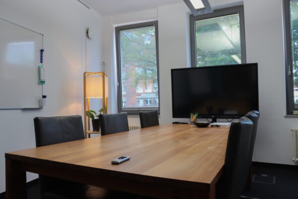 Der Meetingraum M bietet Platz für bis zu 8 Personen und zeichnet sich durch seine klassische, hochwertige Ausstattung aus. Mit einem großen Konferenztisch, einem interaktiven Touchdisplay und einer Videobar für hybride Meetings ist er optimal für Teammeetings, Präsentationen und kreative Workshops ausgestattet. Ein Whiteboard, High-Speed-WLAN, sowie auf Wunsch Getränke-Flats und Catering runden das Angebot ab.